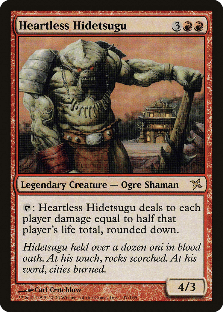 {T}: Heartless Hidetsugu deals damage to each player equal to half that player’s life total, rounded down.