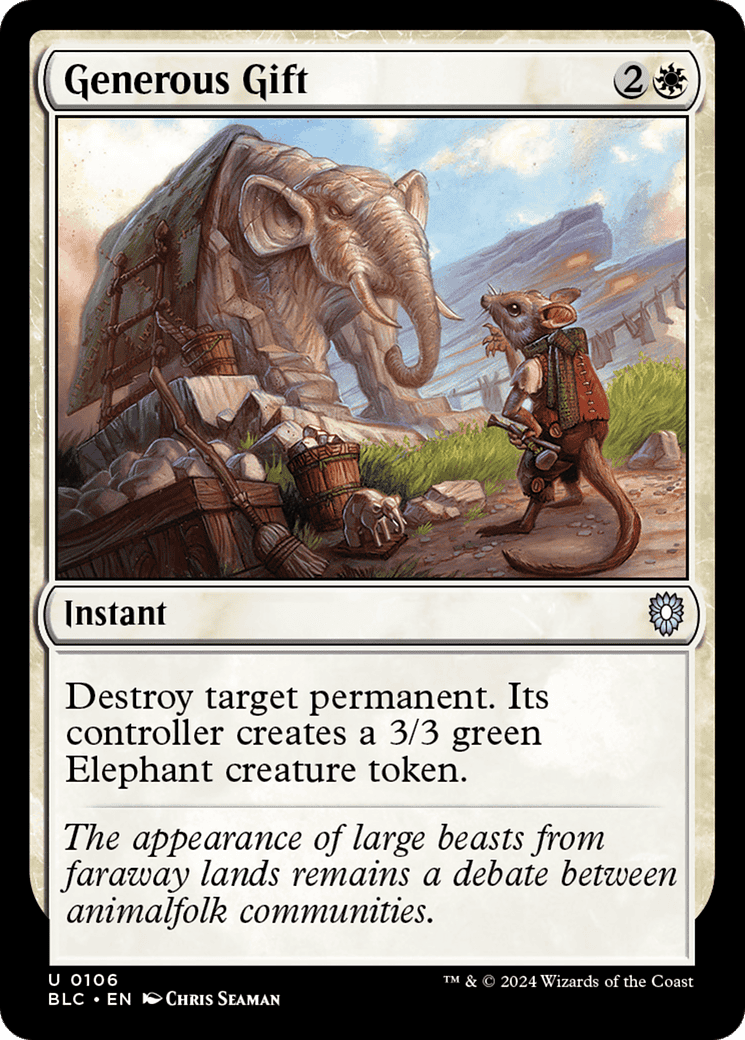 Destroy target permanent. Its controller creates a 3/3 green Elephant creature token.