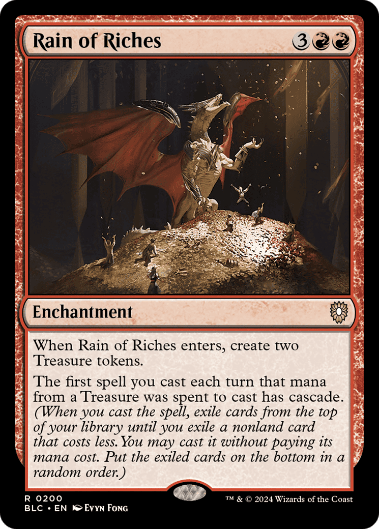 The first spell you cast each turn that mana from a Treasure was spent to cast has cascade. (When you cast the spell, exile cards from the top of your library until you exile a nonland card that co