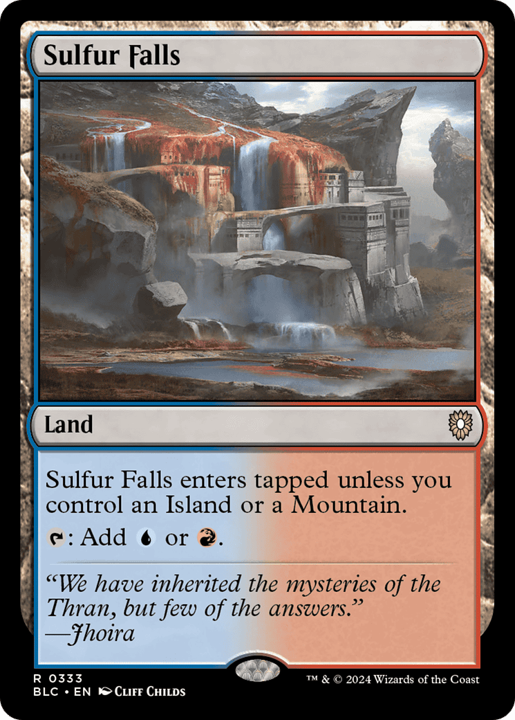 This land enters tapped unless you control an Island or a Mountain. {T}: Add {U} or {R}.