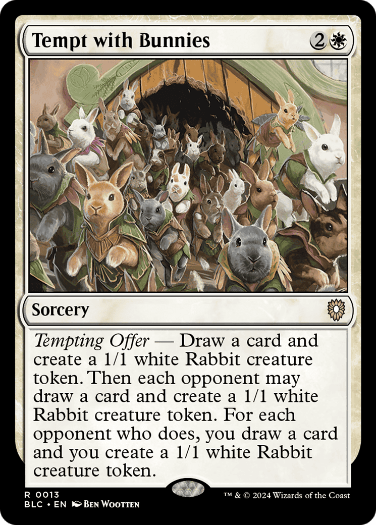 Tempting Offer – Draw a card and create a 1/1 white Rabbit creature token. Then each opponent may draw a card and create a 1/1 white Rabbit creature token. For each opponent who does, you draw a card and you create a 1/1 white Rabbit creature token.