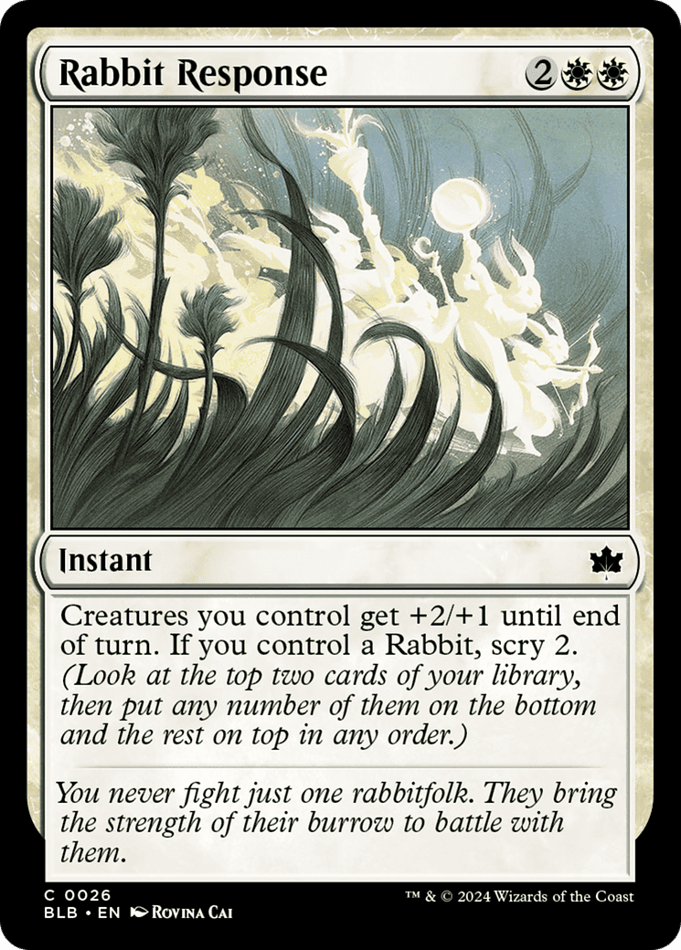 Creatures you control get +2/+1 until end of turn. If you control a Rabbit, scry 2. (Look at the top two cards of your library, then put any number of them on the bottom and the rest on top in any order.)