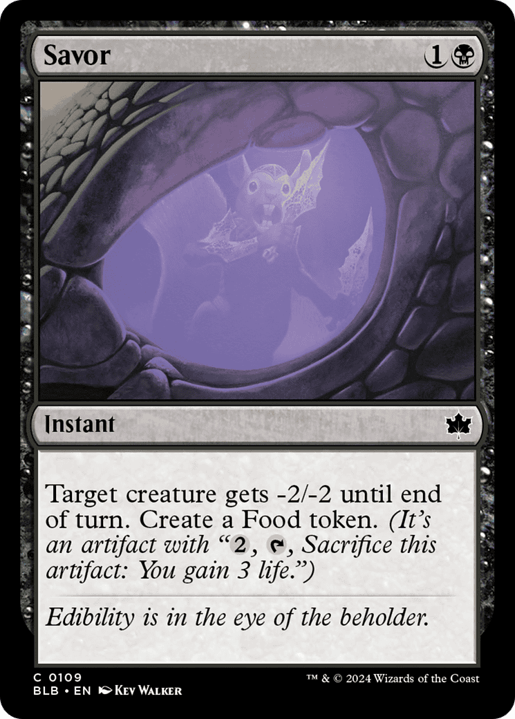 Target creature gets -2/-2 until end of turn. Create a Food token. (It’s an artifact with “{2}, {T}, Sacrifice this token: You gain 3 life.”)