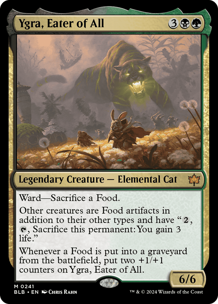 Whenever a Food is put into a graveyard from the battlefield, put two +1/+1 counters on Ygra.