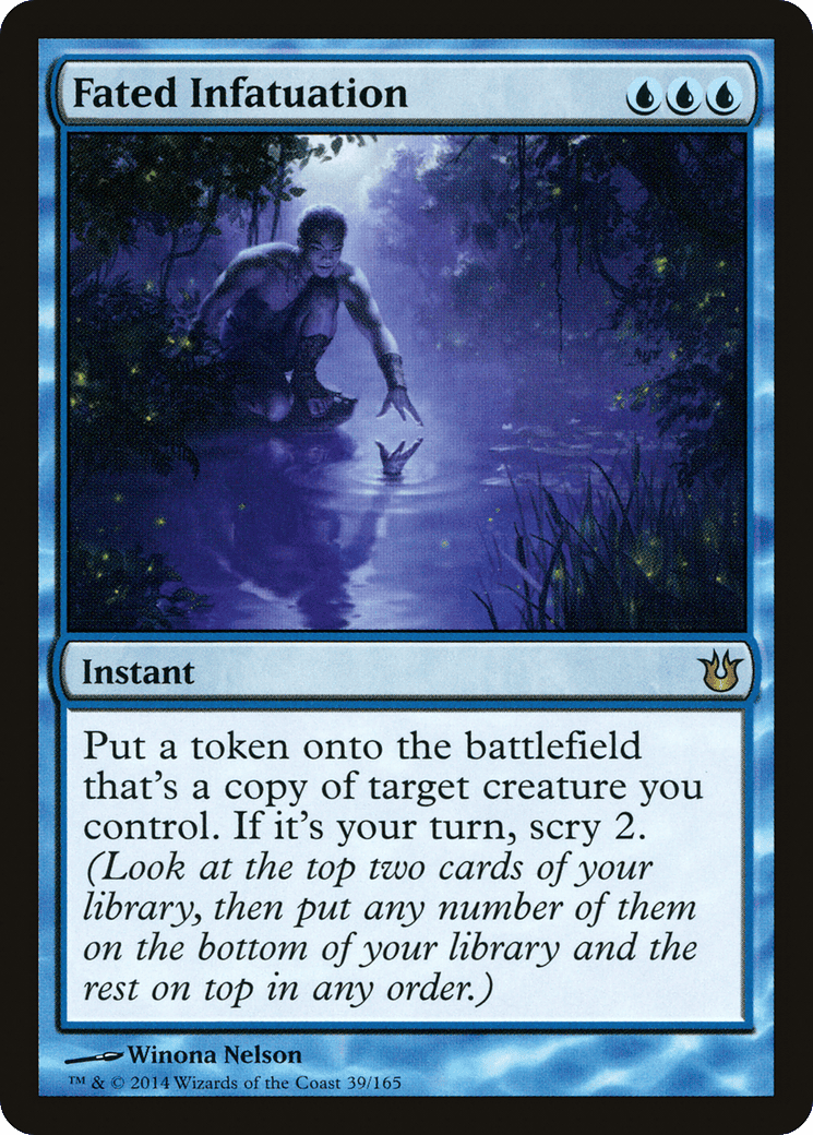 Create a token that’s a copy of target creature you control. If it’s your turn, scry 2.