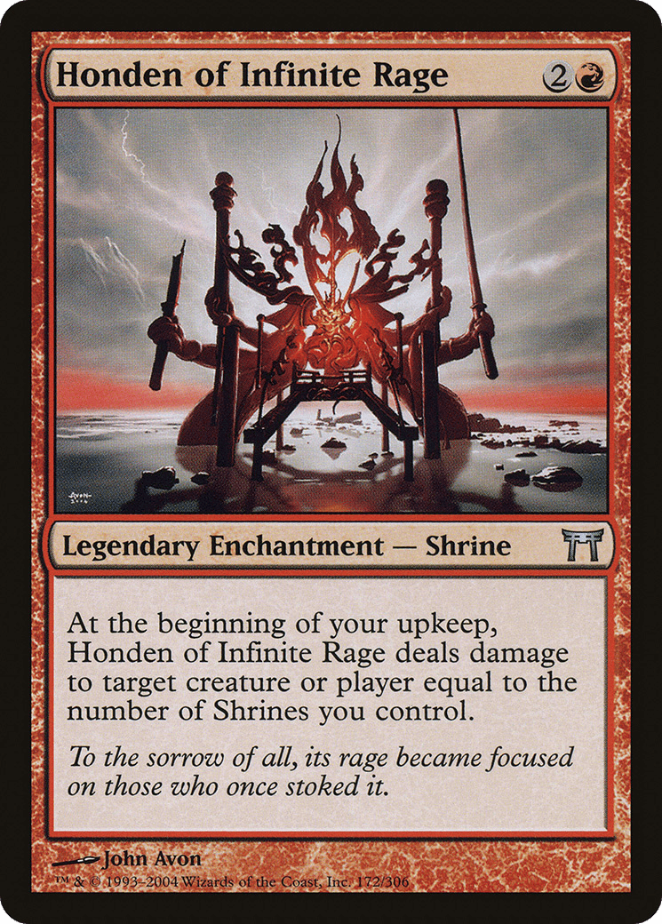 At the beginning of your upkeep, Honden of Infinite Rage deals damage to any target equal to the number of Shrines you control.