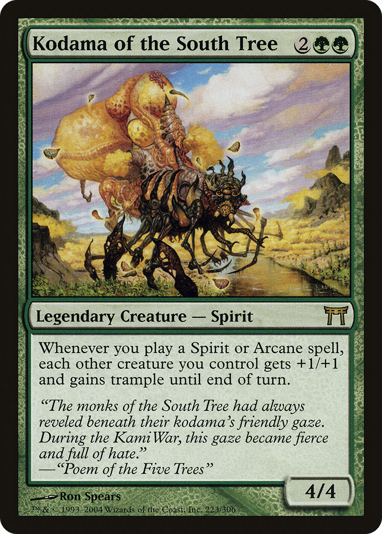 Whenever you cast a Spirit or Arcane spell, each other creature you control gets +1/+1 and gains trample until end of turn.