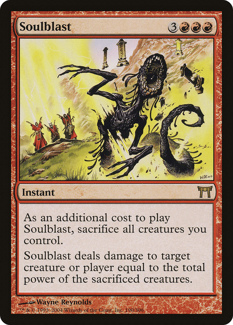 As an additional cost to cast this spell, sacrifice all creatures you control. Soulblast deals damage to any target equal to the total power of the sacrificed creatures.