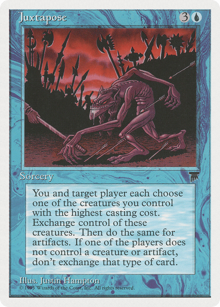 You and target player exchange control of the creature you each control with the greatest mana value. Then exchange control of artifacts the same way. If two or more permanents a player controls are tied for greatest, their controller chooses one of them.