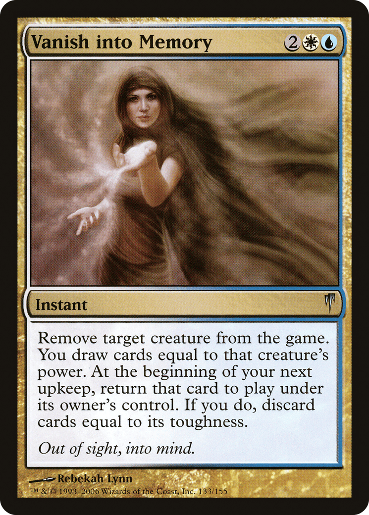 Exile target creature. You draw cards equal to that creature’s power. At the beginning of your next upkeep, return that card to the battlefield under its owner’s control. If you do, discard cards equal to that creature’s toughness.