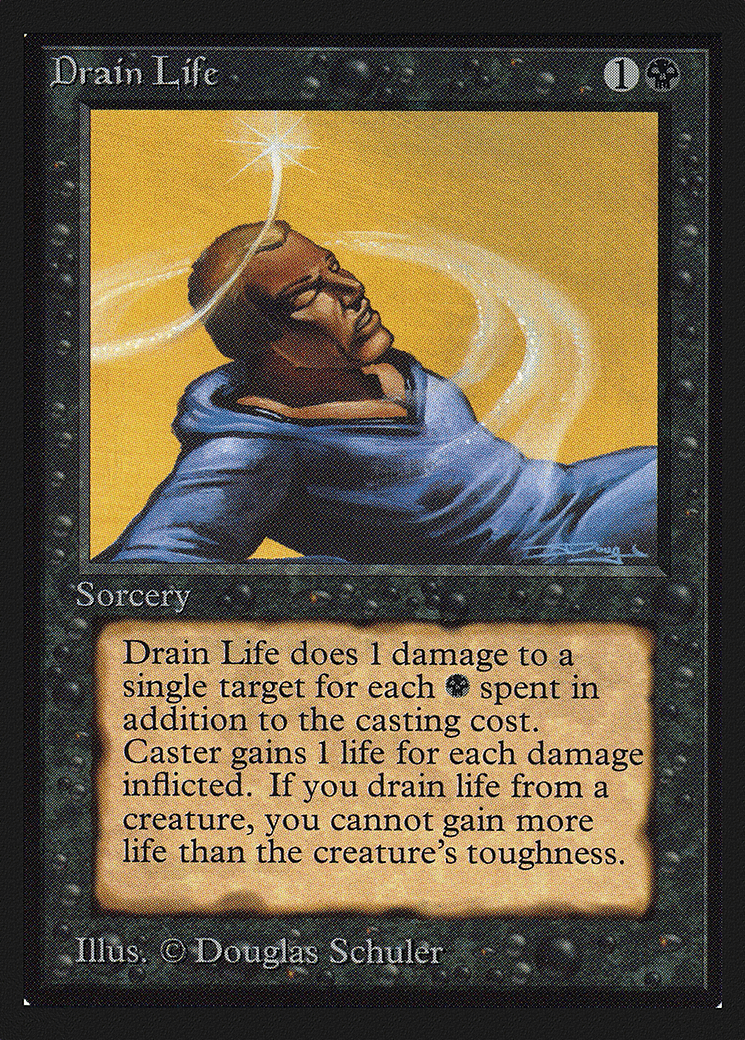 Drain Life deals X damage to any target. You gain life equal to the damage dealt, but not more life than the player’s life total before the damage was dealt, the planeswalker’s loyalty before the damage was dealt, or the creatu