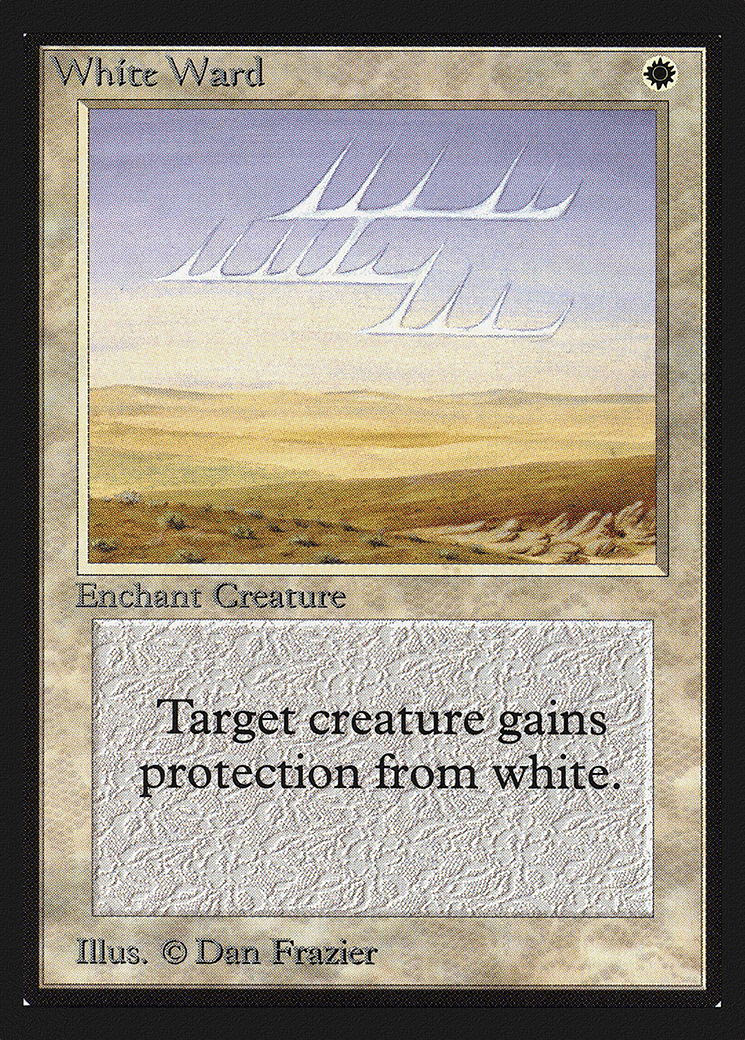 Enchant creature Enchanted creature has protection from white. This effect doesn’t remove this Aura.