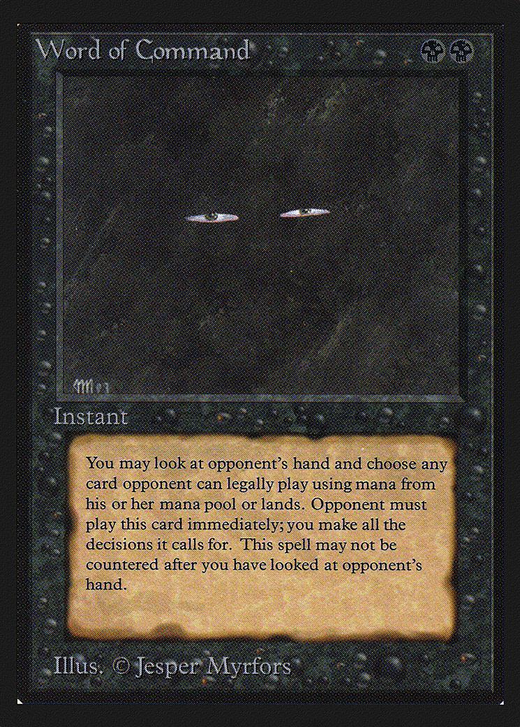 Look at target opponent’s hand and choose a card from it. You control that player until Word of Command finishes resolving. The player plays that card if able. While doing so, the player can activate mana abilities only if they’re from lands that player c