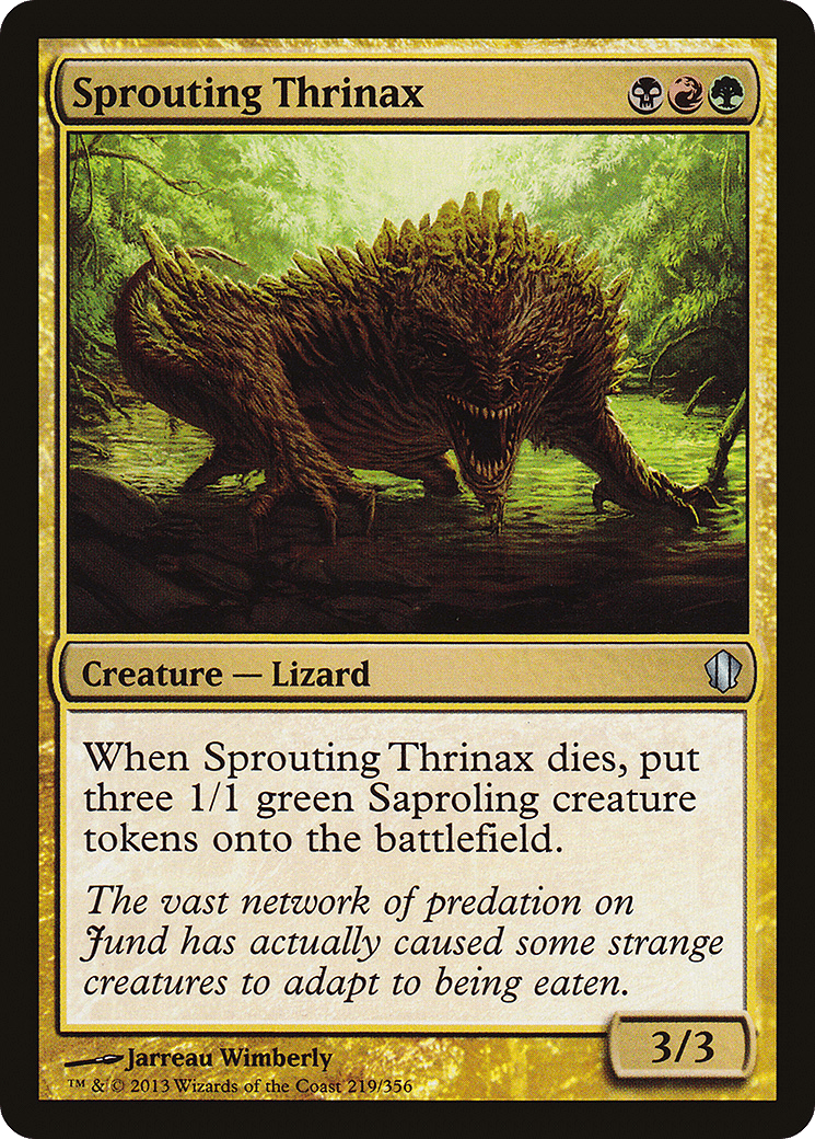 When this creature dies, create three 1/1 green Saproling creature tokens.