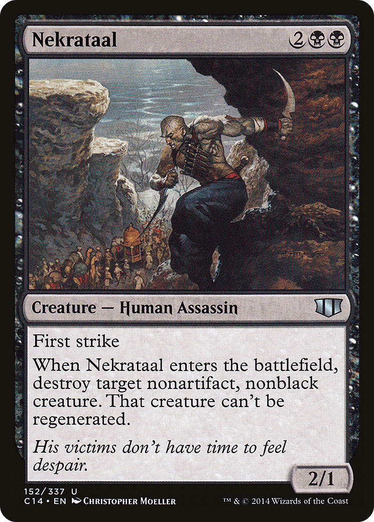 When this creature enters, destroy target nonartifact, nonblack creature. That creature can’t be regenerated.