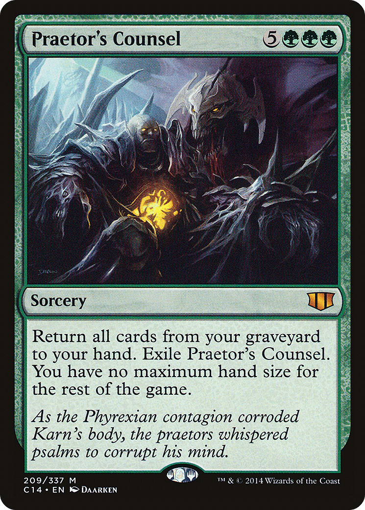 Return all cards from your graveyard to your hand. Exile Praetor’s Counsel. You have no maximum hand size for the rest of the game.