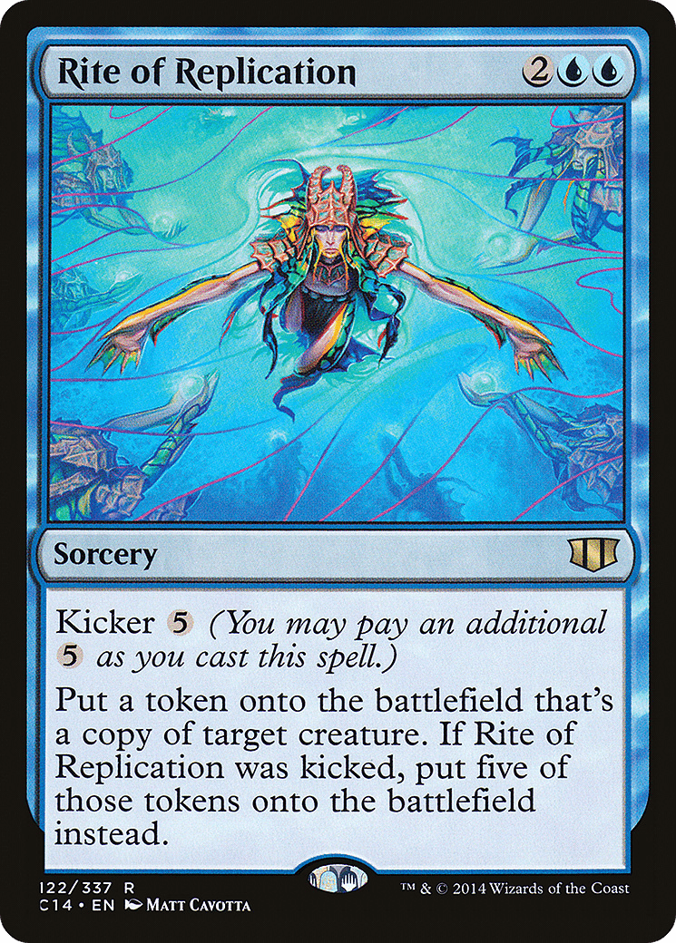 Kicker {5} (You may pay an additional {5} as you cast this spell.) Create a token that’s a copy of target creature. If this spell was kicked, create five of those tokens instead.