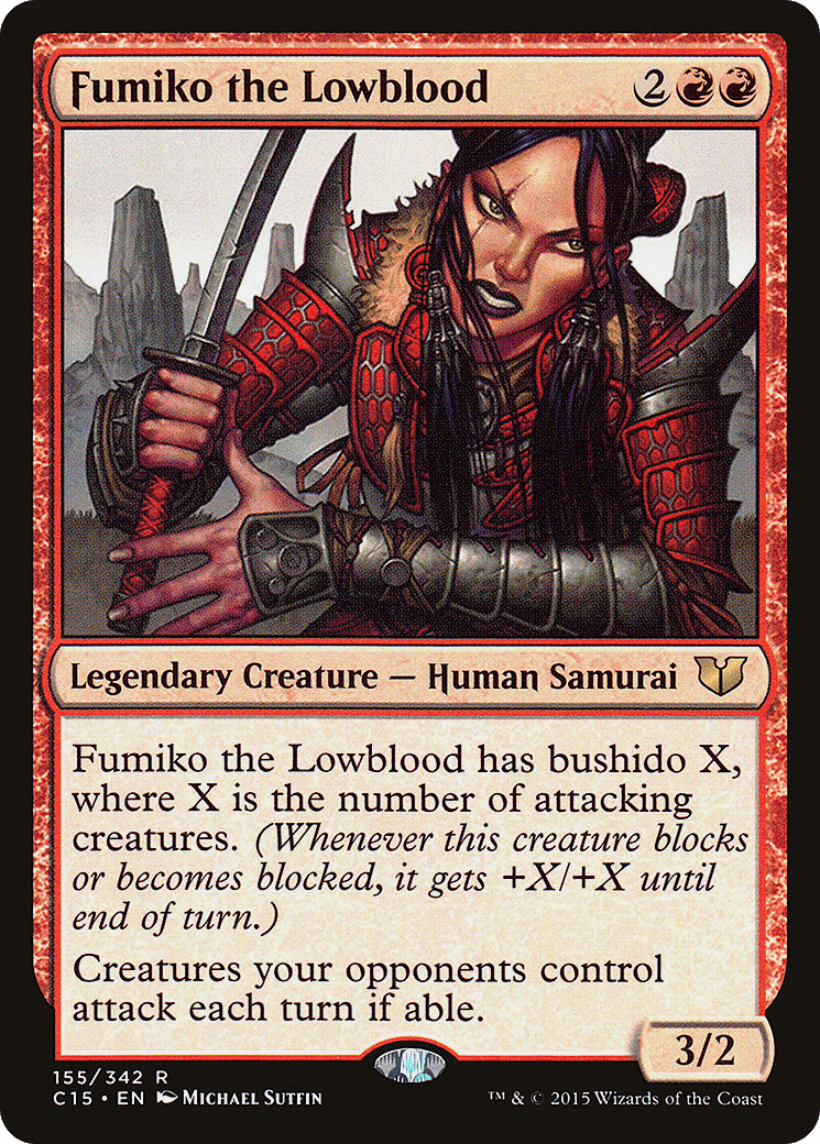 Fumiko has bushido X, where X is the number of attacking creatures. (Whenever this creature blocks or becomes blocked, it gets +X/+X until end of turn.)