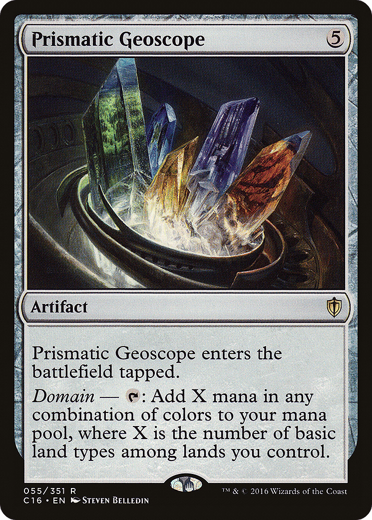 This artifact enters tapped. Domain – {T}: Add X mana in any combination of colors, where X is the number of basic land types among lands you control.
