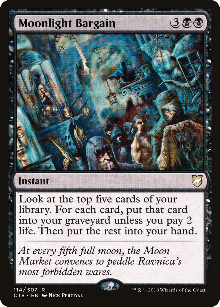At every fifth full moon, the Moon Market convenes to peddle Ravnica’s most forbidden wares.