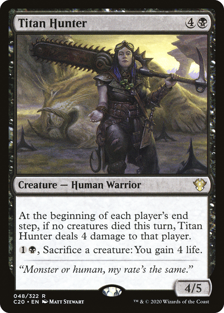 At the beginning of each player’s end step, if no creatures died this turn, this creature deals 4 damage to that player.