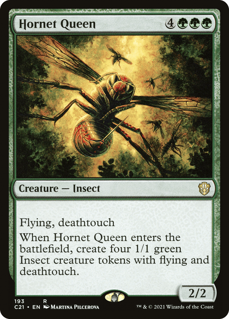 Flying, deathtouch When this creature enters, create four 1/1 green Insect creature tokens with flying and deathtouch.