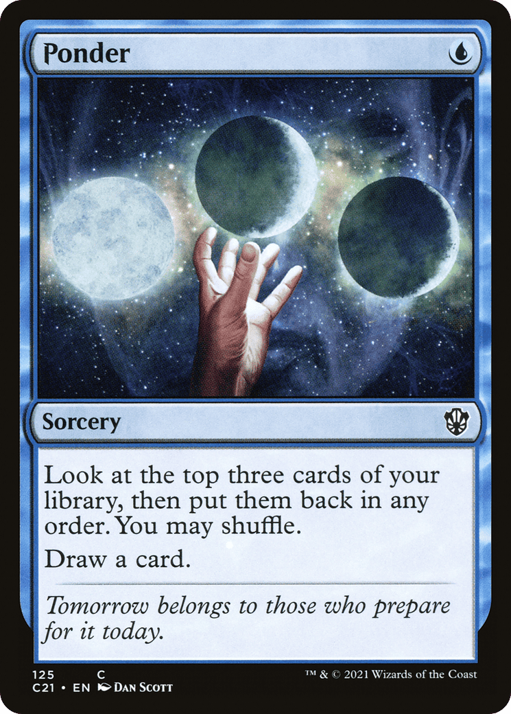 Look at the top three cards of your library, then put them back in any order. You may shuffle. Draw a card.
