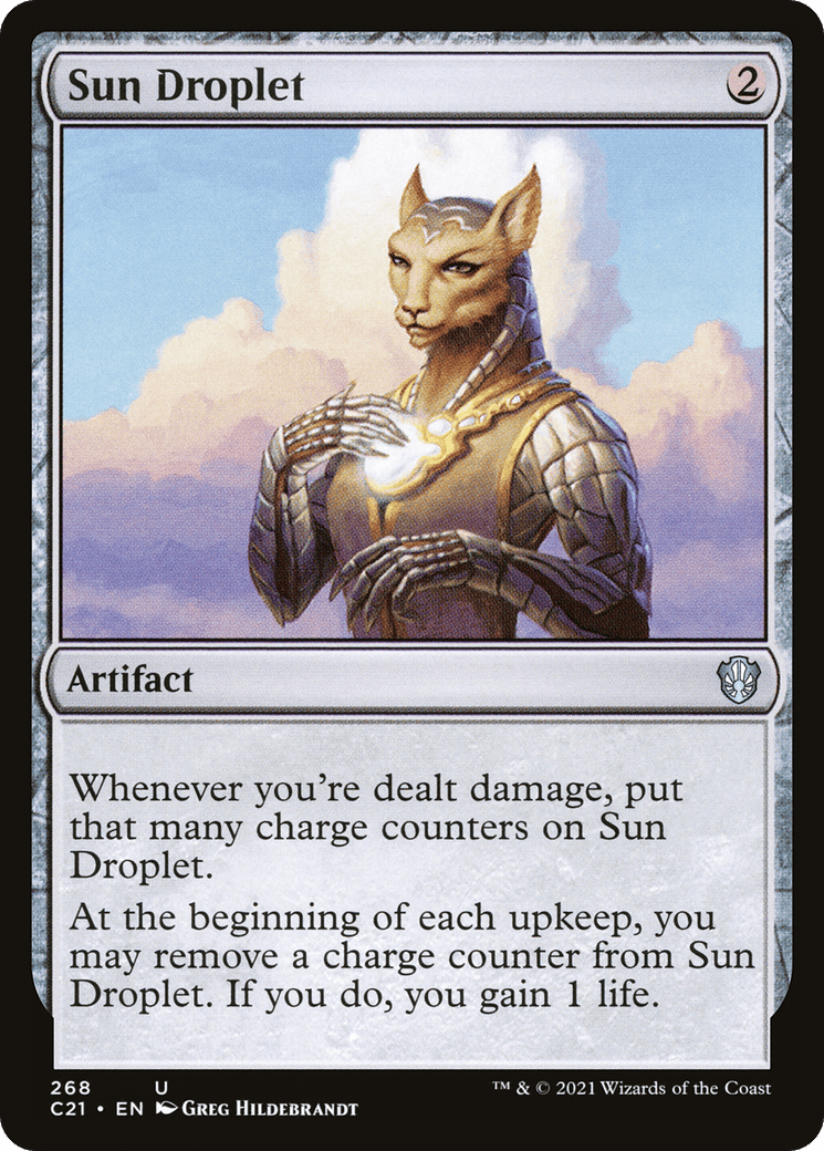Whenever you’re dealt damage, put that many charge counters on this artifact.
