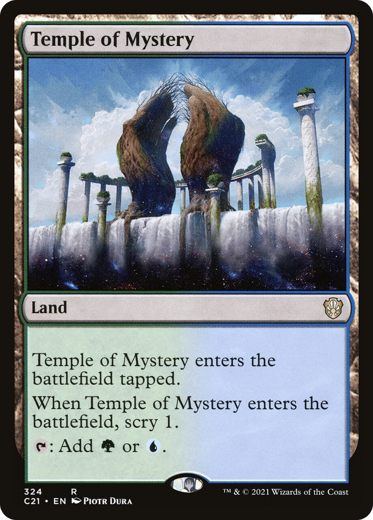 This land enters tapped. When this land enters, scry 1. (Look at the top card of your library. You may put that card on the bottom.) {T}: Add {G} or {U}.