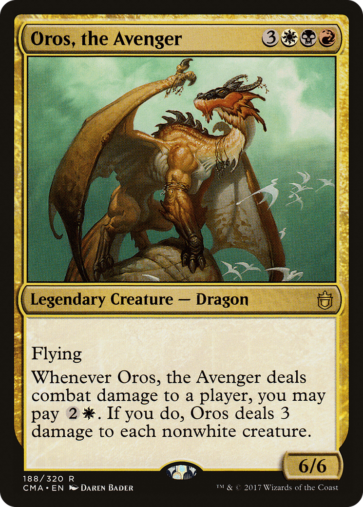 Flying Whenever Oros deals combat damage to a player, you may pay {2}{W}. If you do, Oros deals 3 damage to each nonwhite creature.