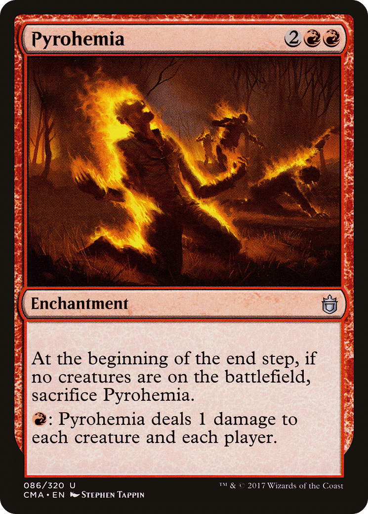 At the beginning of the end step, if no creatures are on the battlefield, sacrifice this enchantment. {R}: This enchantment deals 1 damage to each creature and each player.