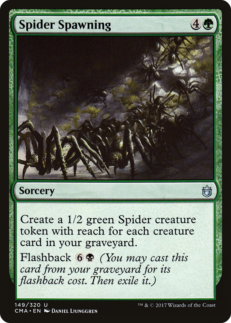 Create a 1/2 green Spider creature token with reach for each creature card in your graveyard.