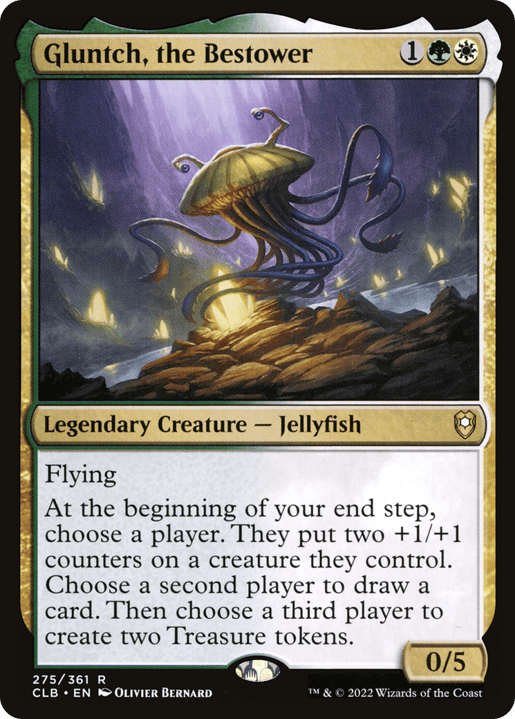 At the beginning of your end step, choose a player. They put two +1/+1 counters on a creature they control. Choose a second player to draw a card. Then choose a third player to create two Treasure tokens.