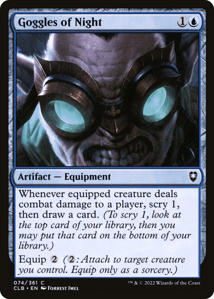 Whenever equipped creature deals combat damage to a player, scry 1, then draw a card. (To scry 1, look at the top card of your library, then you may put that card on the bottom.)
