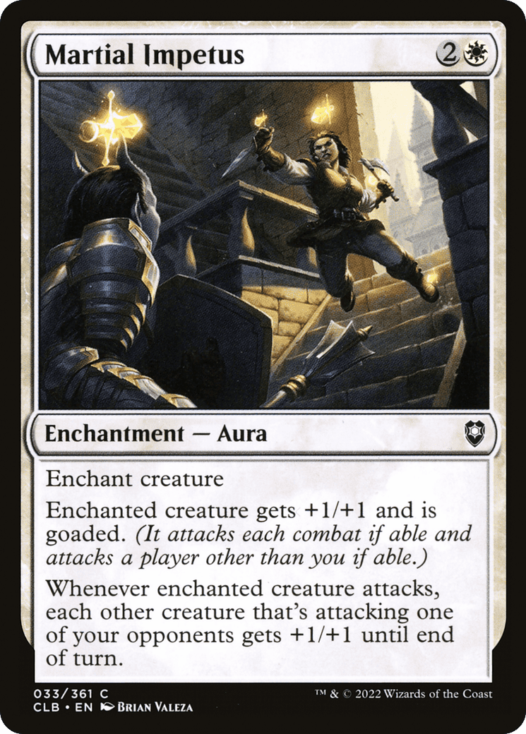 Whenever enchanted creature attacks, each other creature that’s attacking one of your opponents gets +1/+1 until en