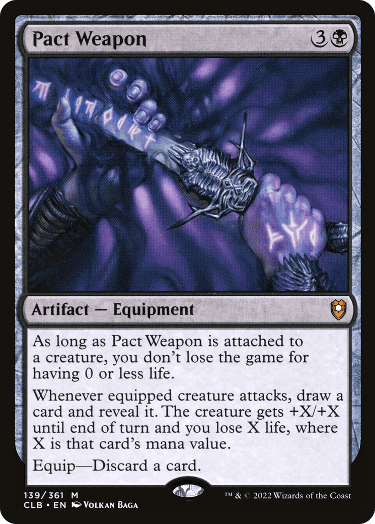 Whenever equipped creature attacks, draw a card and reveal it. The creature gets +X/+X until end of turn and you lose X life, where X is that card’s ma