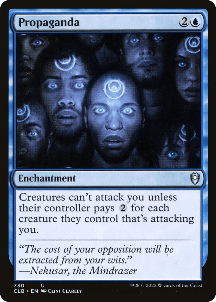 Creatures can’t attack you unless their controller pays {2} for each creature they control that’s attacking you.