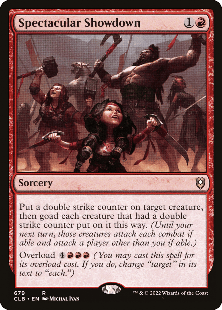 Put a double strike counter on target creature, then goad each creature that had a double strike counter put on it this way. (Until your next turn, those creatures attack each combat if able and attack a player other than you if able.)