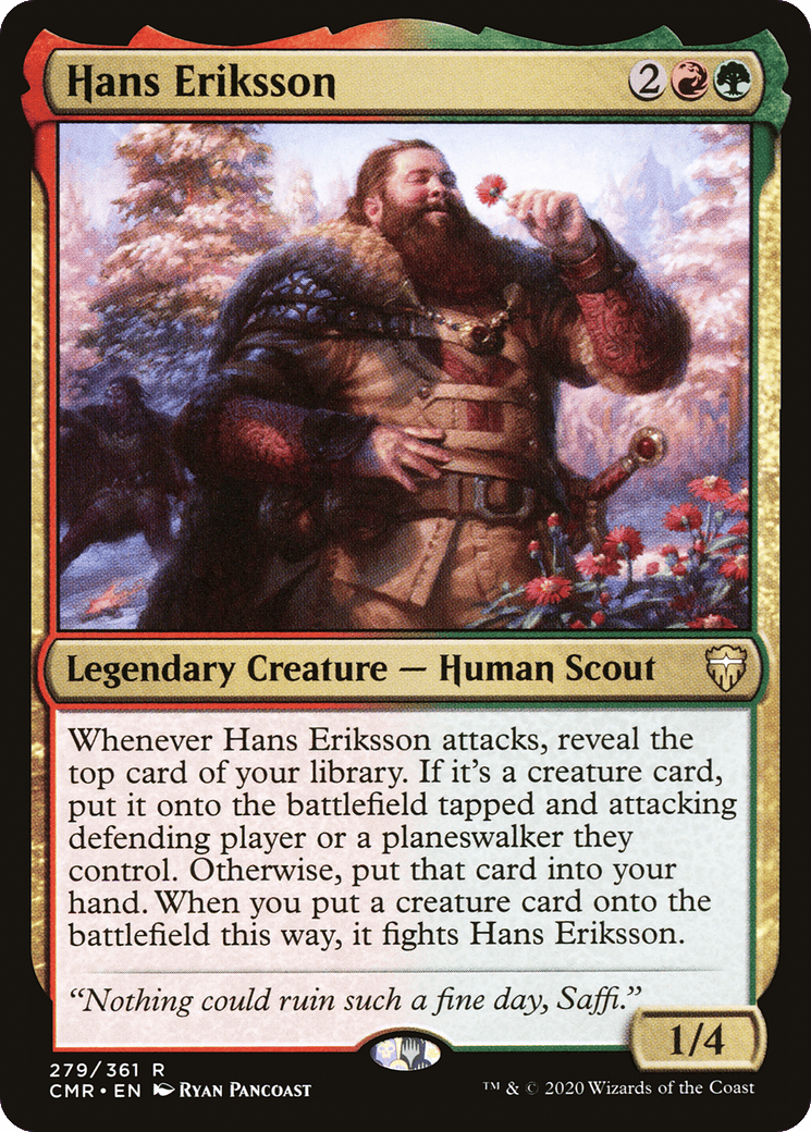 Whenever Hans Eriksson attacks, reveal the top card of your library. If it’s a creature card, put it onto the battlefield tapped and attacking defending player or a planeswalker they control. Otherwise, put that card into your hand. When you put a creatur