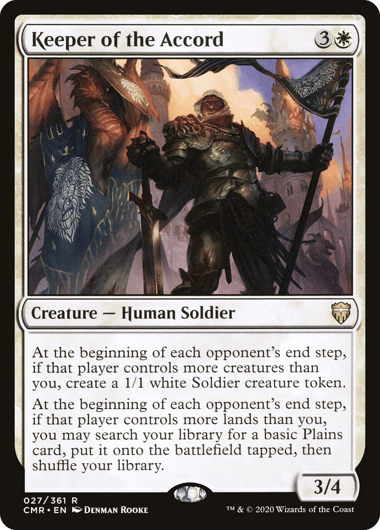 At the beginning of each opponent’s end step, if that player controls more creatures than you, create a 1/1 white Soldier creature token.