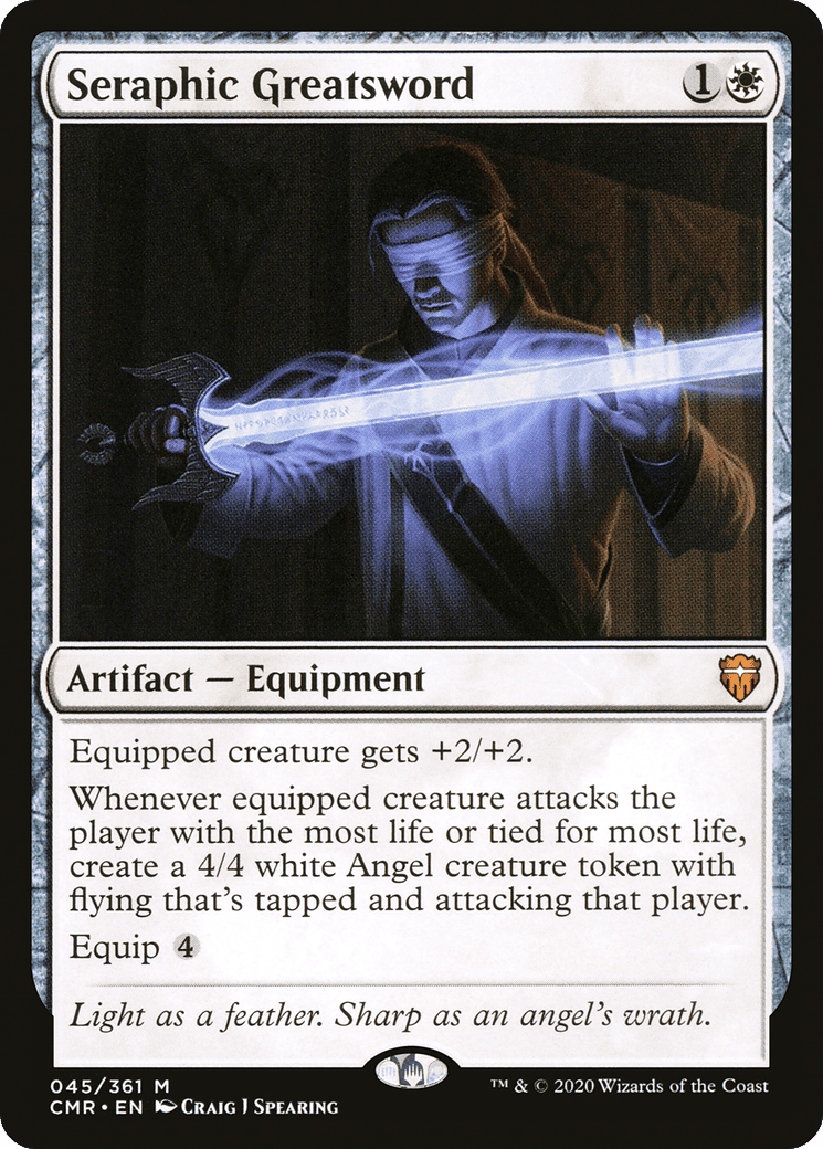 Whenever equipped creature attacks the player with the most life or tied for most life, create a 4/4 white Angel creature token with flying that’s tapped and attacking that player.