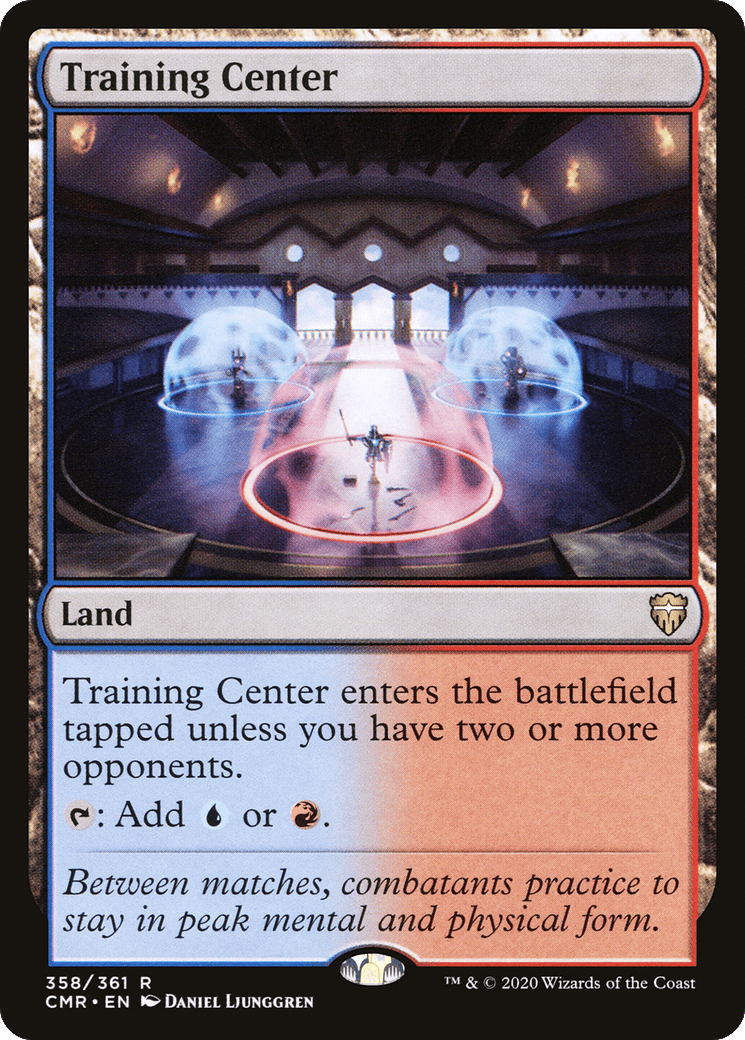 This land enters tapped unless you have two or more opponents. {T}: Add {U} or {R}.
