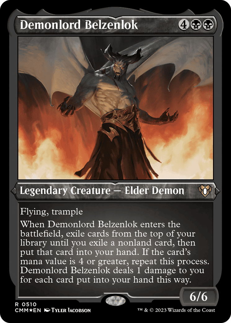 When Demonlord Belzenlok enters, exile cards from the top of your library until you exile a nonland card, then put that card into your hand. If the card’s mana value is 4 or greater, repeat this process. Demonlord Belzenlok deals 1 damage