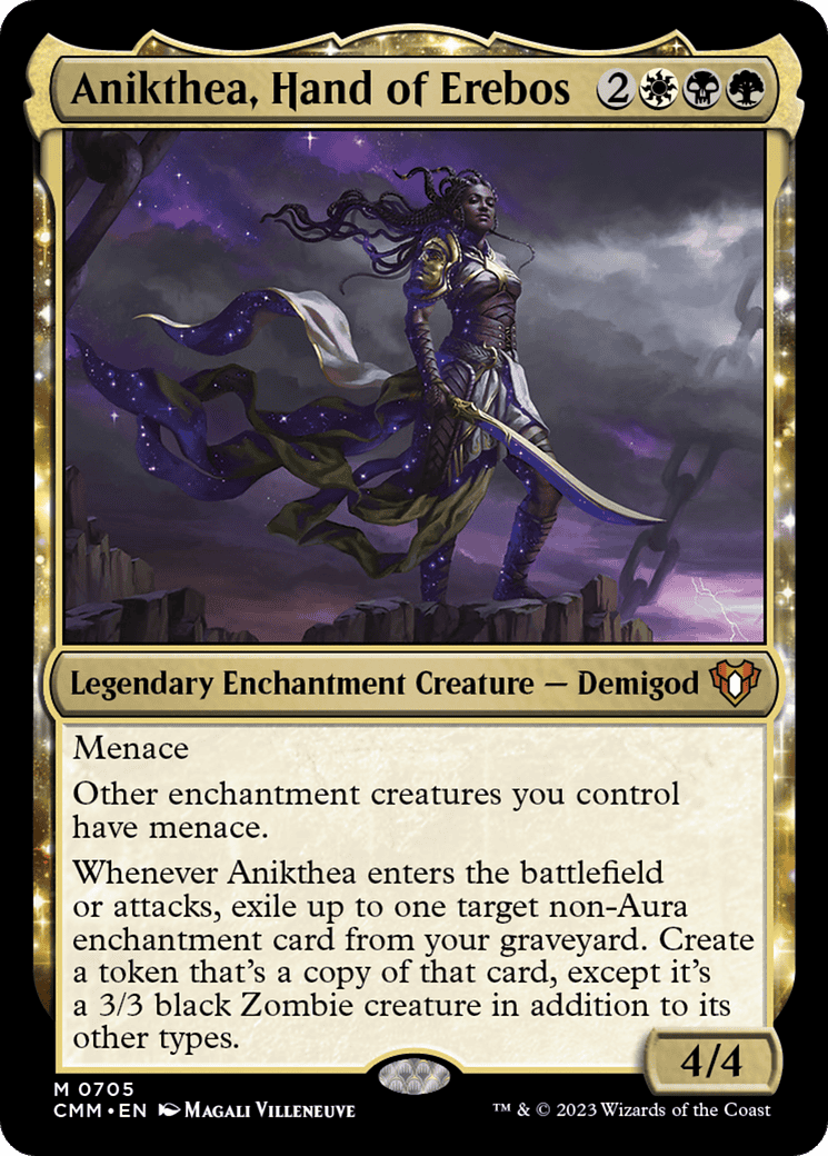 Whenever Anikthea enters or attacks, exile up to one target non-Aura enchantment card from your graveyard. Create a token that’s a copy of that card, except it’s a 3/3 black Zombie creature in ad
