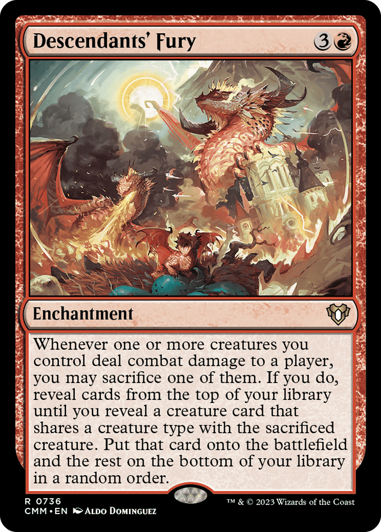 Whenever one or more creatures you control deal combat damage to a player, you may sacrifice one of them. If you do, reveal cards from the top of your library until you reveal a creature card that shares a creature type with the sacrificed creature. Put t