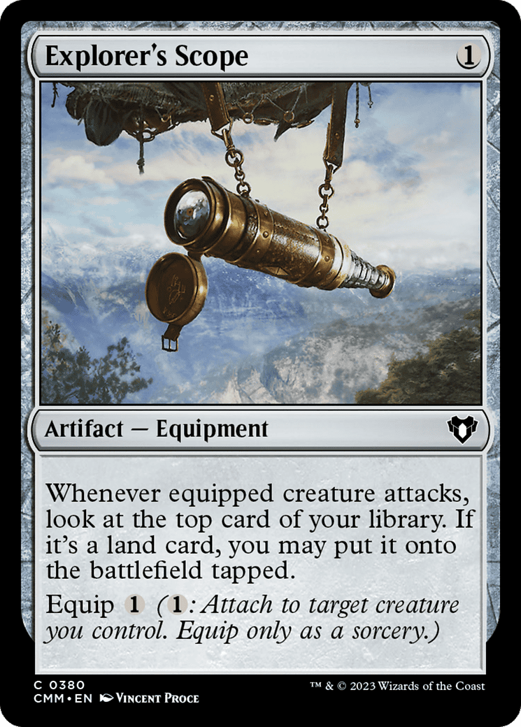 Whenever equipped creature attacks, look at the top card of your library. If it’s a land card, you may put it onto the battlefield tapped.