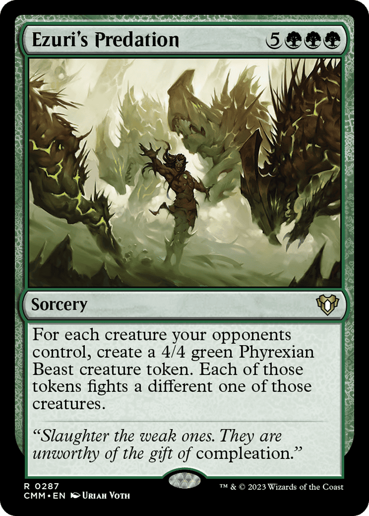 For each creature your opponents control, create a 4/4 green Phyrexian Beast creature token. Each of those tokens fights a different one of those creatures.
