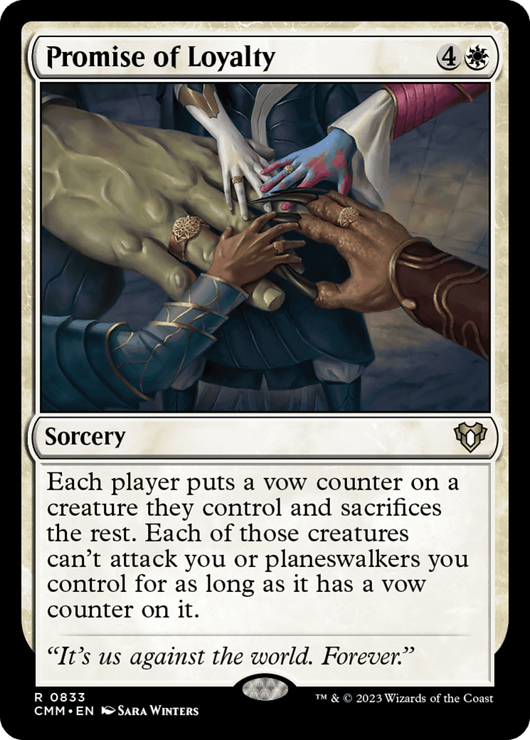 Each player puts a vow counter on a creature they control and sacrifices the rest. Each of those creatures can’t attack you or planeswalkers you control for as long as it has a vow counter on it.