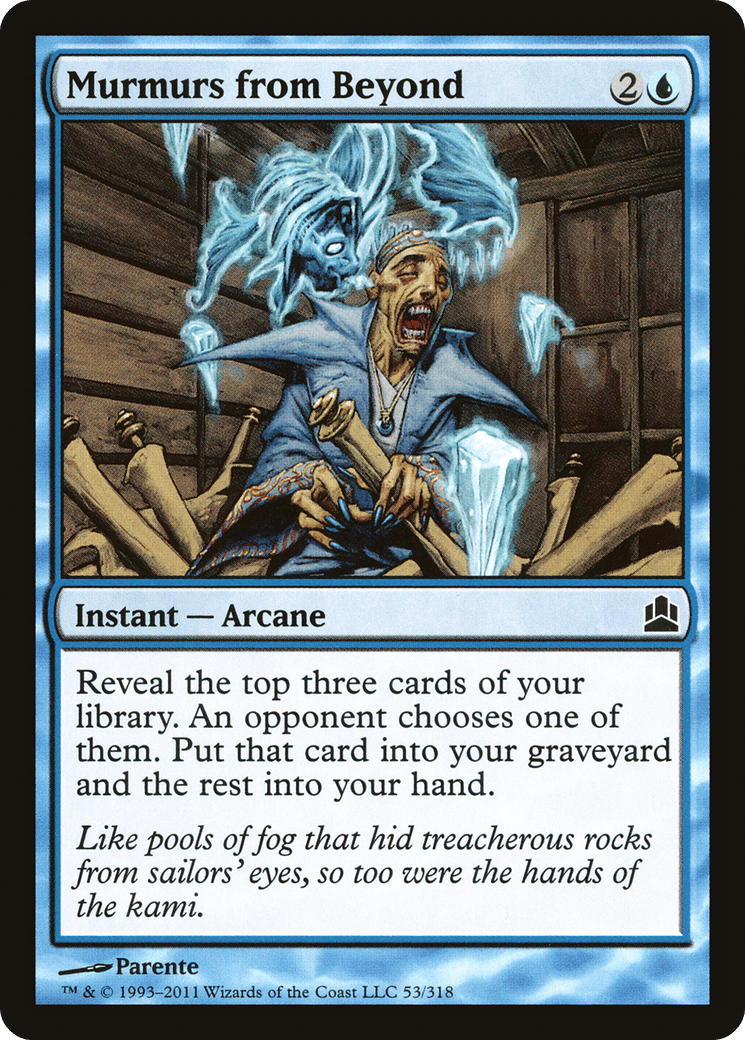 Reveal the top three cards of your library. An opponent chooses one of them. Put that card into your graveyard and the rest into your hand.