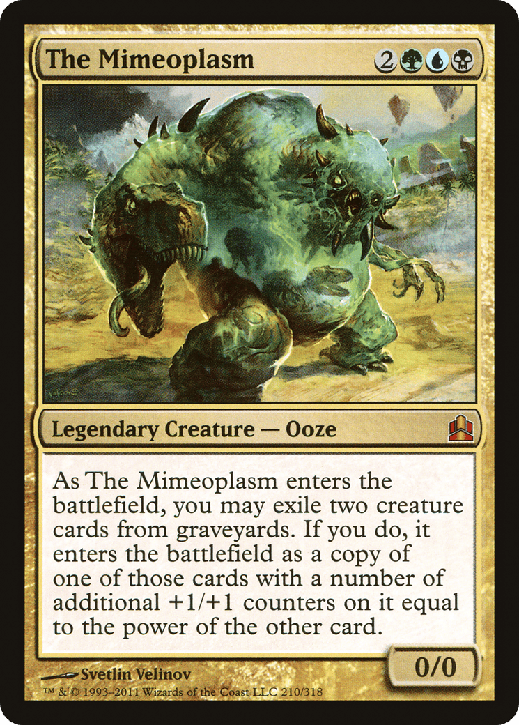 As The Mimeoplasm enters, you may exile two creature cards from graveyards. If you do, it enters as a copy of one of those cards with a number of additional +1/+1 counters on it equal to the power of the other card.